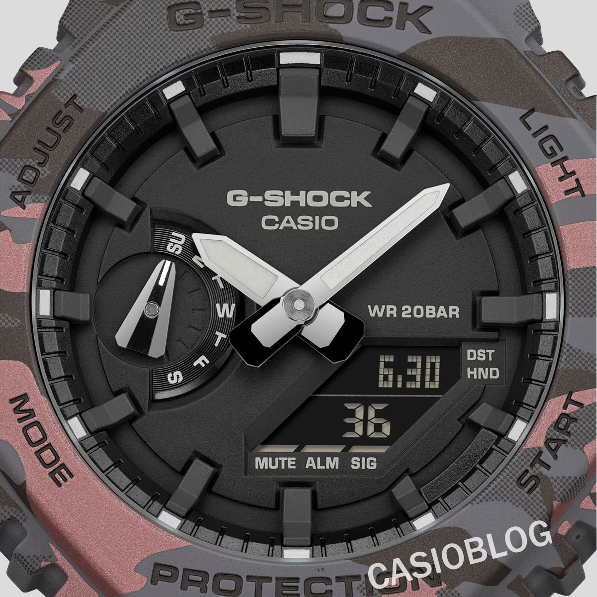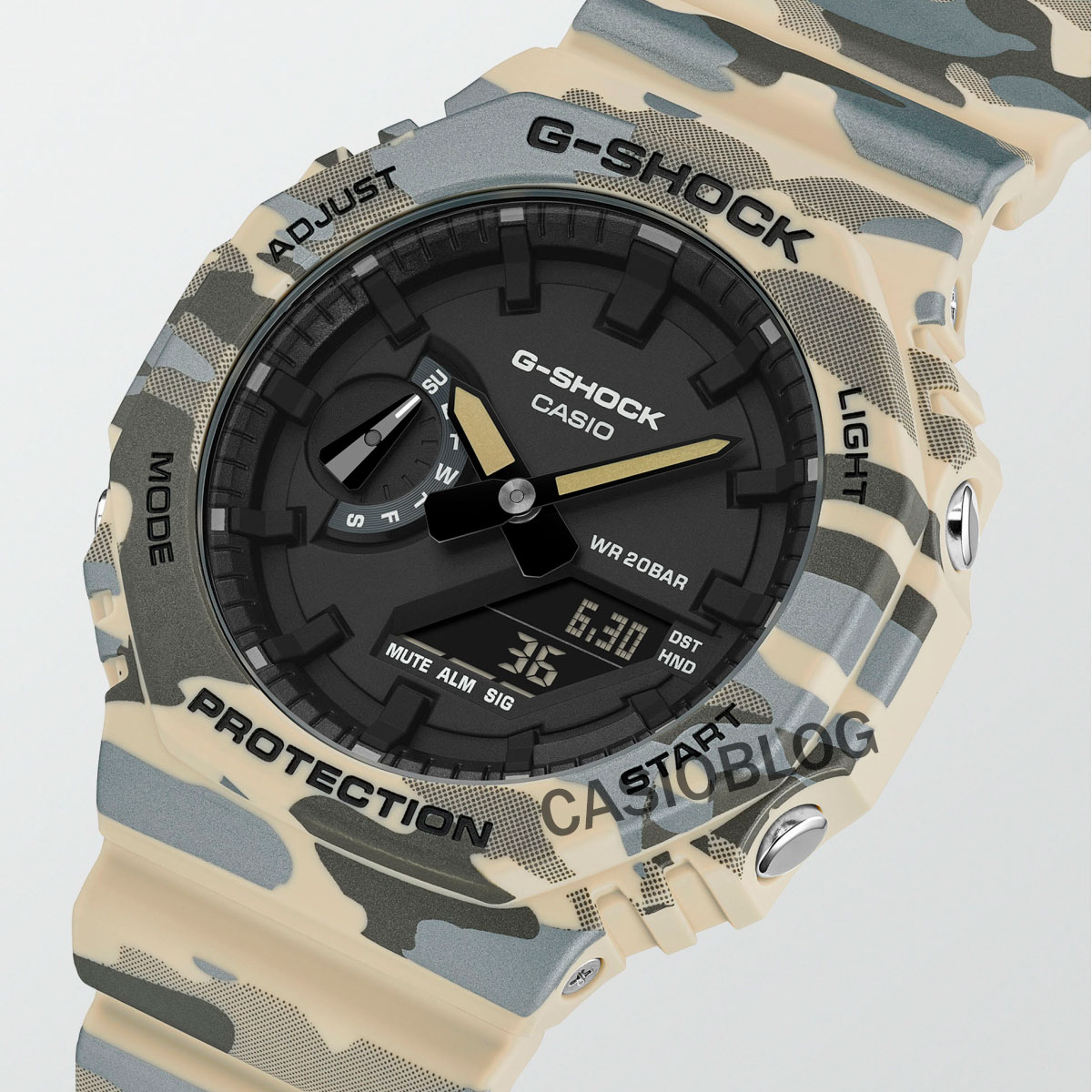 Amint a mellékelt képeken látható, a Casio erősen a taktikai esztétikára támaszkodik, mindkét modell fordított (negatív) kijelzővel rendelkezik, katonai álcázási mintákkal díszített szíjakkal és lünettákkal párosítva. A GA-2100CM-8A lila-szürke színű, szürke-nehezített terepszínű, míg a GA-2100CM-5A a sivatagi ihletésű homok és bézs színű terepszínt választja. A Casioblog szerint a terepszínű csíkok mellett megjelenő pöttyös mintákat lézerfestési technológiával alkalmazzák, hogy 3D-s hatást érjenek el.