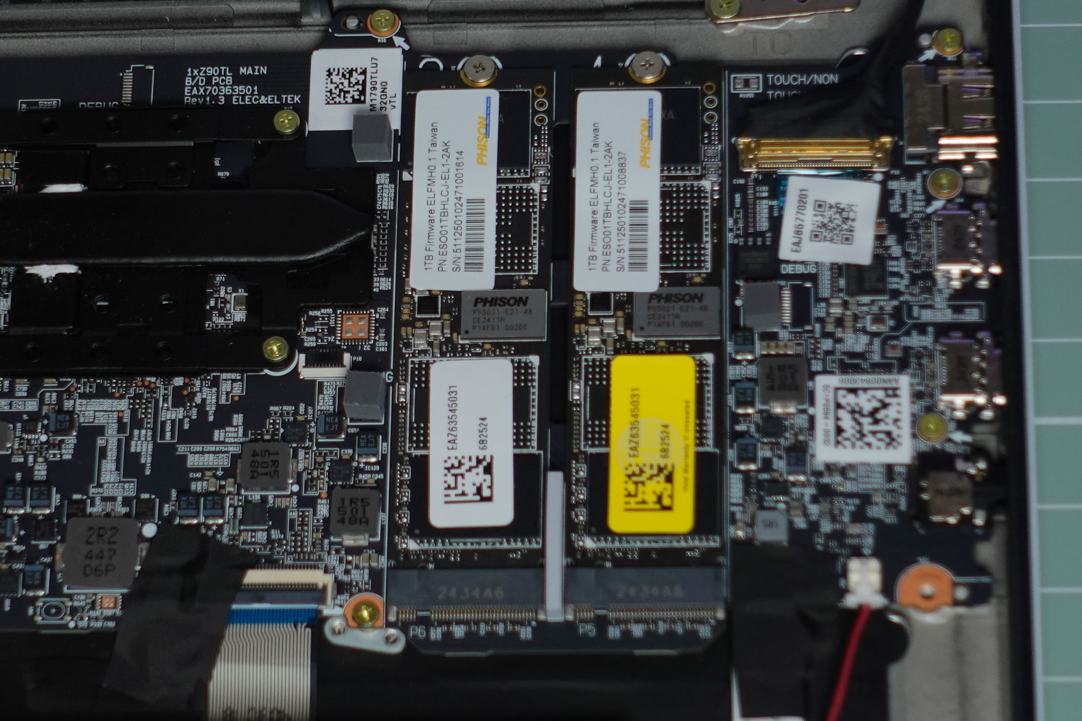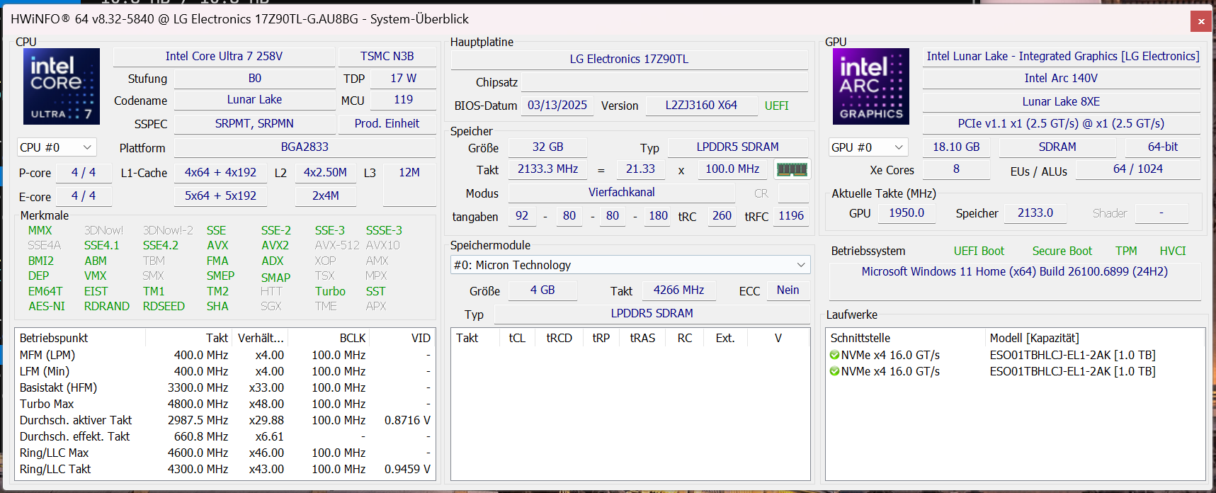 A Lunar Lake-kel az Intel új utat nyit a processzorok tervezésében. A hangsúly itt kevésbé a többszálúságra, sokkal inkább a kiváló energiahatékonyságra helyeződik. A RAM közvetlenül a processzorcsomagba van integrálva ezeknél a CPU-knál, ami korlátozza az elérhető memóriakonfigurációkat. Jelenleg a Lunar Lake processzorokkal ellátott Gram modellek csak a Core Ultra 7 256V vagy a 258V processzorral kaphatók. Ez 16 GB vagy 32 GB RAM-mal rendelkező konfigurációkat jelent. Tesztkészülékünk a 32 GB-os konfigurációt használja. Továbbá különböző tárolókonfigurációk állnak rendelkezésre a piacon. A mi készülékünk két NVMe SSD-vel volt felszerelve, amelyek egyenként 1 TB tárhelyet biztosítanak.