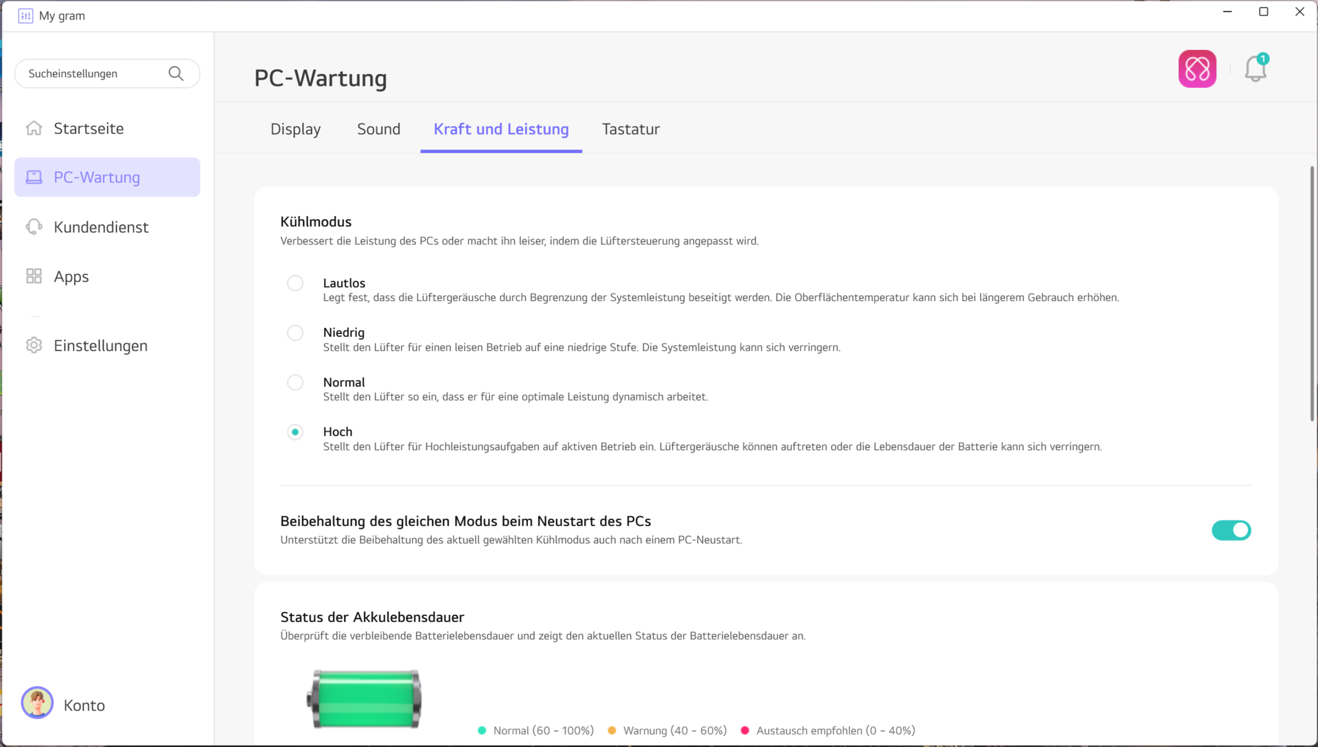 A MyGram alkalmazásban négy különböző teljesítményprofil van előre beállítva. Ezek az előre beállított beállítások a (majdnem) csendes ventilátoroktól a magas ventilátor-kihasználtságig terjednek. Ennek ellenére a stresszteszt zajmérései során azt tapasztaltuk, hogy igényes forgatókönyvek esetén a "Normál" beállítás és a "Magas" hűtési mód mindössze egy-két dB(A) eltérést mutatott. Ezért minden benchmarkunk és mérésünk során a legerősebb hűtési módot választottuk.