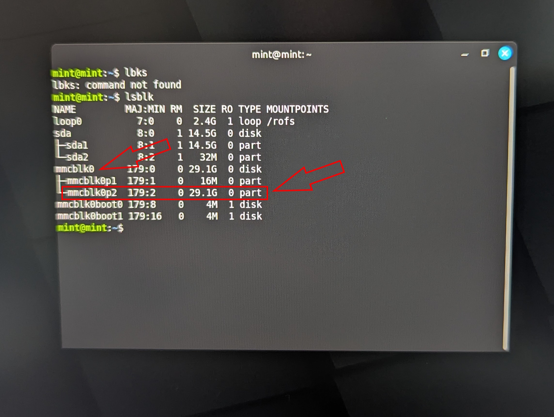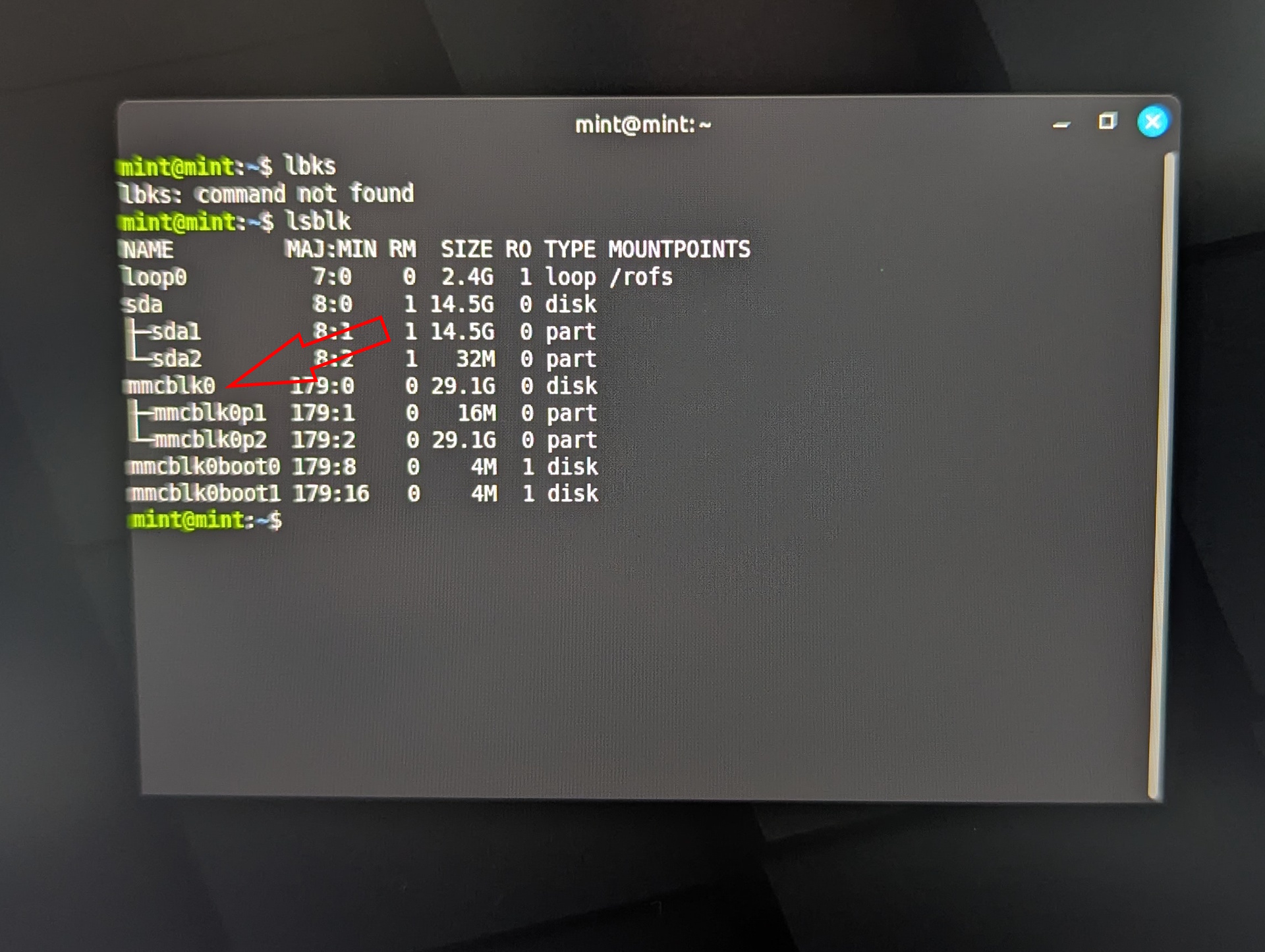 Ez a parancs kilistázza az összes tárolóeszközt. A belső eMMC tároló mmcblk néven jelenik meg. Más x86-os rendszereken a név eltérhet. Az USB-meghajtók általában sda, sdb stb. néven jelennek meg.