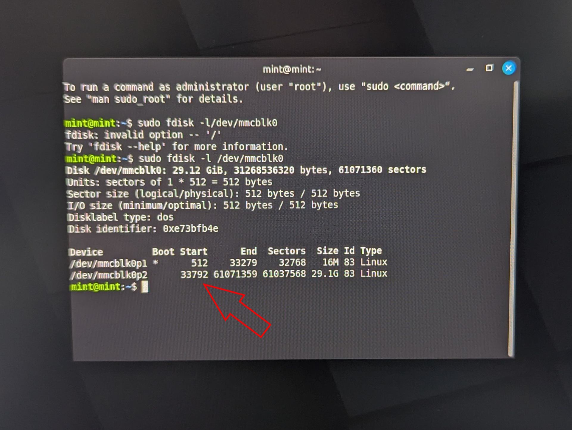 Ennek a lépésnek a kitalálása elég sok időt vett igénybe. Bár a GParted egy lehetőségnek tűnt, végül nem vezetett sehova. A legmegbízhatóbb módszer az fdisk használata volt.