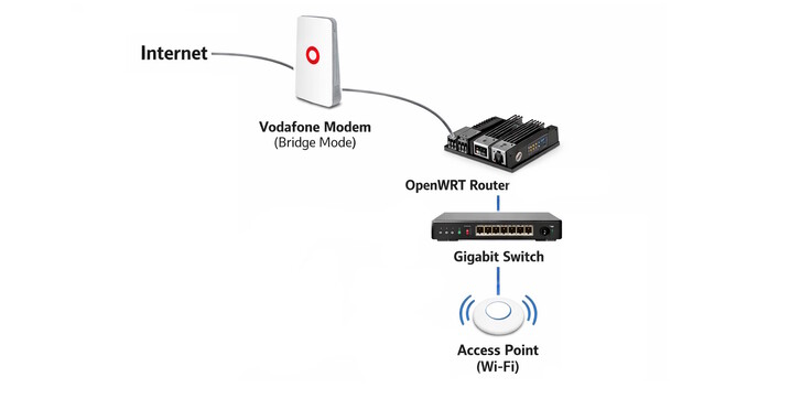 A Vodafone régóta használt routerem mindent egyesít: modem, router és Wi-Fi hozzáférési pont. Az ötlet most az, hogy ezeket a funkciókat több eszközre osszuk fel. A Vodafone doboza csak egyszerű modemként fog működni, a router és a Wi-Fi funkciókat kikapcsolva. Egy alacsony fogyasztású mini-PC lesz az új router, a Wi-Fi-t pedig egy külön energiatakarékos hozzáférési pont fogja kezelni. Közöttük egy kis kapcsoló fogja összekötni a LAN-eszközöket (például egy PC-t Etherneten keresztül, egy AV-vevőt vagy egy otthoni szervert). A beállítás nagyjából így fog kinézni: