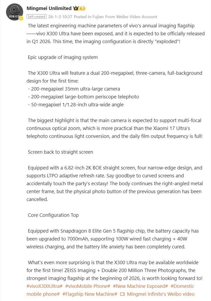 Az év első hétvégéje egy meglehetősen látványos pletykát hoz nekünk a Vivo X300 Ultra-ról, amely várhatóan az első Vivo Ultra zászlóshajó lesz, amely világszerte megjelenik, és várhatóan az első negyedévben, valószínűleg márciusban debütál. Egy Weibo felhasználó szerint (lásd az alábbi képernyőképet) szerint a Vivo X300 Ultra egy 200MP-es 35 mm-es fő kamerával, egy 200MP-es periszkópos teleobjektív kamerával és egy nagyméretű, 1/1,28 hüvelykes 50MP-es ultraszéles kamerával fog rendelkezni, ami nem éppen új információ.