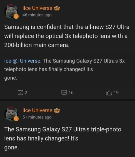 Érdekes módon ez egy nappal azután történt, hogy az Ice Universe közzétett egy rendert a Galaxy S27 Ultra-ról, és kérte a közösség véleményét a dizájnnal kapcsolatban. A renderelésen három kamera is szerepelt a hátlapon. Ez tehát arra enged következtetni, hogy az Ice Universe Galaxy S27 Ultra renderelése több lehet, mint egy egyszerű rajongói kép.