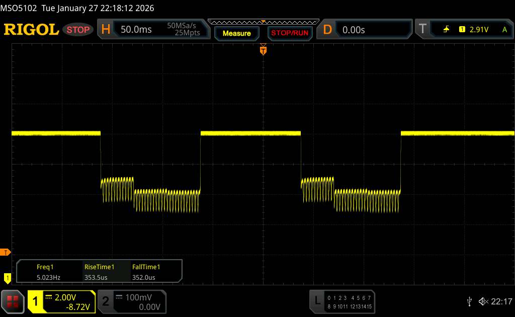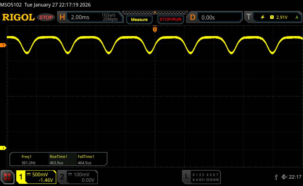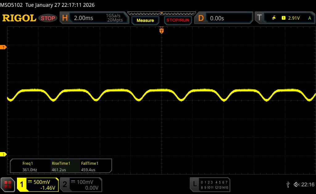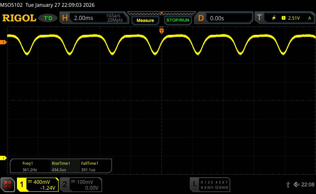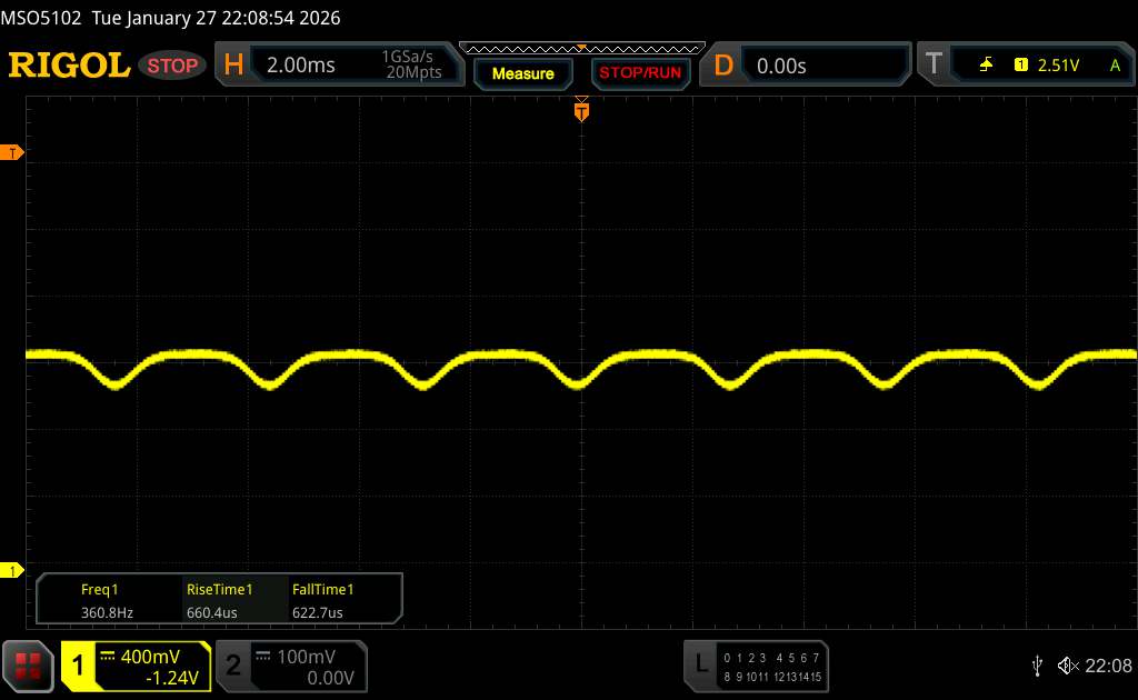 Az oszcilloszkóp segítségével 360 Hz-es alapfrekvenciát mértünk. Azonban a nagyfrekvenciás, 1500 Hz-nél nagyobb PWM dimmelést is alkalmaznak, így az érzékeny felhasználók egészségére gyakorolt hatások korlátozottak maradhatnak.