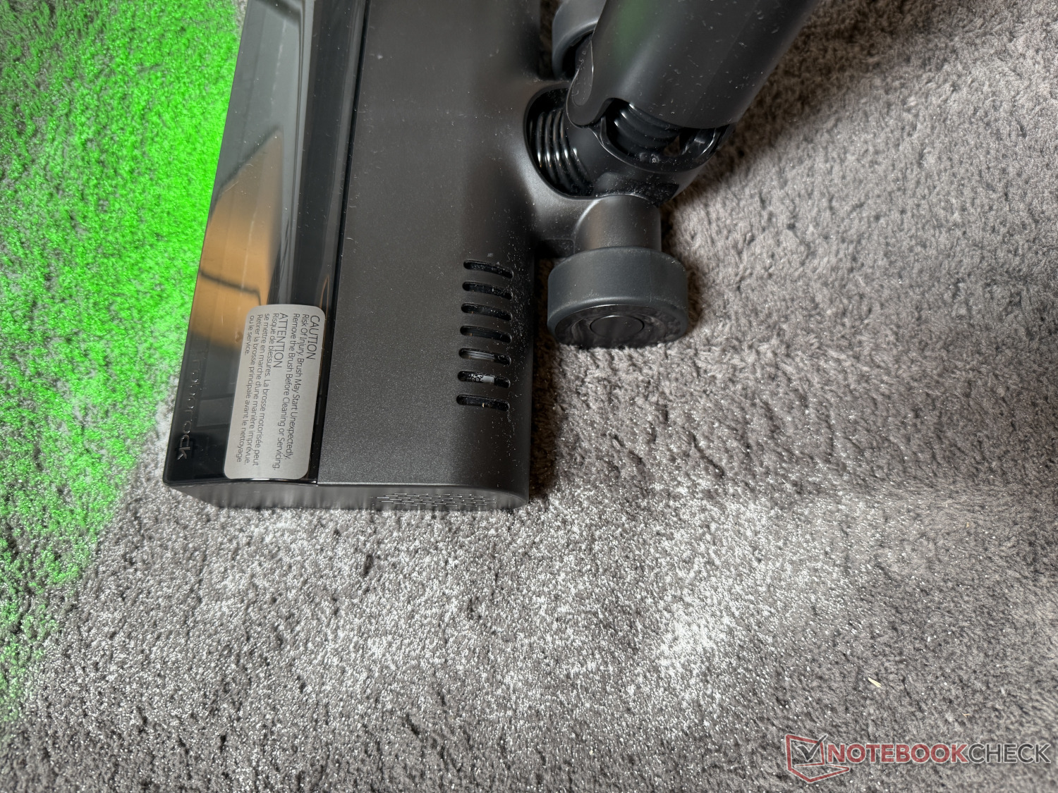 A Roborock H60 Hub Ultra a tesztben szereplő szőnyegeken is jól teljesített, és még hosszabb bolyhos szőnyegek esetén is képes volt sok szennyeződést eltávolítani, de nem mindent. Az erősen szennyezett területeken (például finom homokkal) történő többszöri áthaladás után azonban a szennyeződés nagy részét felszedte. A haj alig akadt össze a hengeren, így kézi beavatkozásra általában nincs szükség. A padlókefén lévő zöld fény praktikus funkció. Ez több szennyeződést tesz láthatóvá.