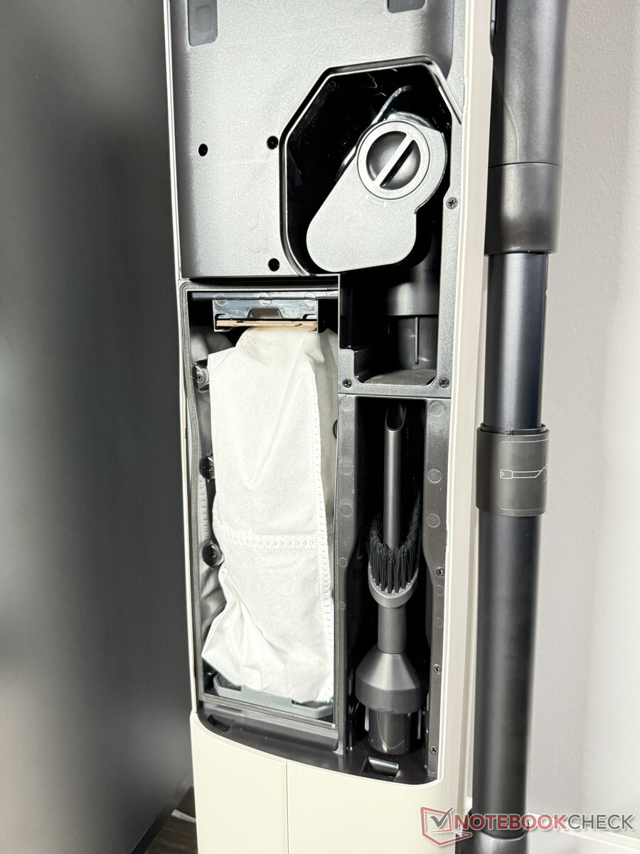 A táskához való hozzáféréshez az állomás bal oldalán lévő mágneses panelt el kell távolítani. Sajnos ez nem nyílik ki, mint egy ajtó, de a kezedben van. A porzsák mellett a mellékelt tartozékok közül kettőnek is van hely: a motoros mini kefének és a 2 az 1-ben réskefének. Ez azt jelenti, hogy a tartozékok mindig a helyén vannak.