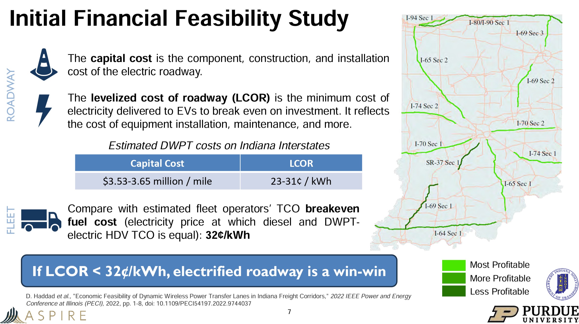 A sikeres teszt megmutatta, hogy az olyan elektromos teherautók töltése, mint a Tesla Semi menet közben is megvalósítható vállalkozás, amely lehetővé tenné az autógyártók számára, hogy csökkentsék az elektromos járművek legdrágább alkatrészének, az akkumulátorcsomagnak a méretét. Az indianai közlekedési minisztérium szerint a dinamikusan töltődő úton a dízelüzemanyag és a villamos energia árának megtérülési költsége 32 cent/kWh, míg a tesztrendszerük üzemeltetési költsége 23-31 cent/kWh, így az induktív autópályát win-win forgatókönyvnek nevezik, legalábbis Indianában.