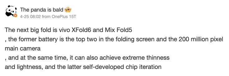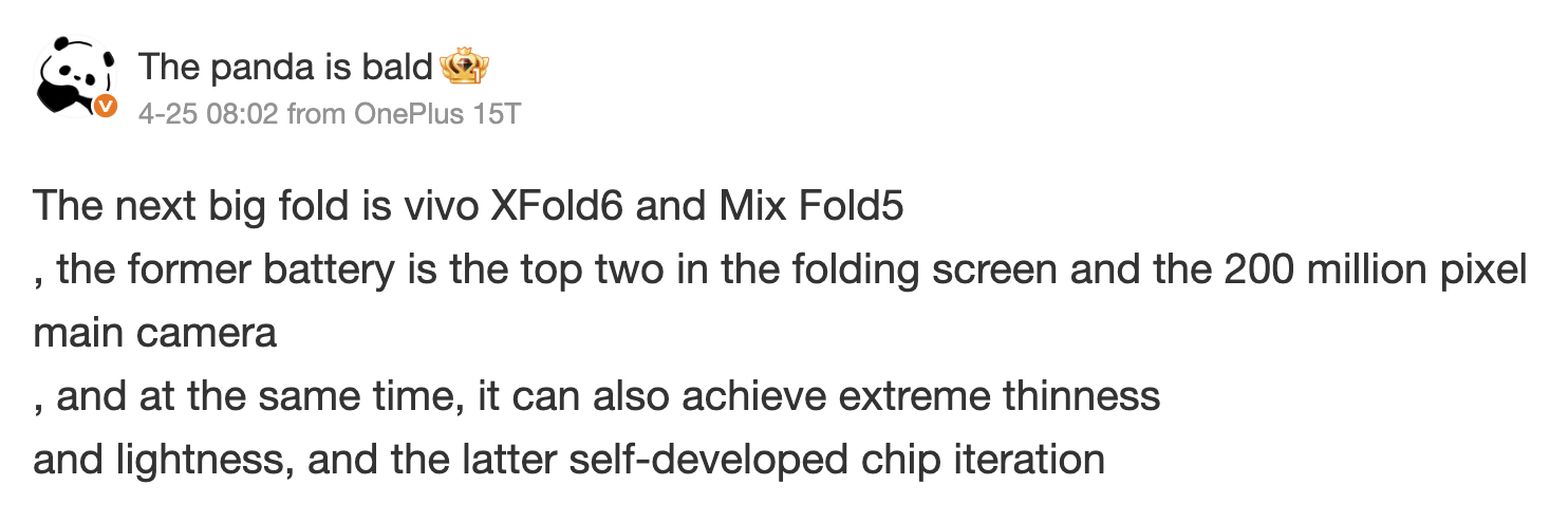 Korábban, Smart Pikachu állítólag hogy a Vivo következő könyv stílusú összehajtható készüléke X Fold6 néven fog piacra kerülni. Most a Kopasz Panda mérlegelte az X Fold6 pletykákat, ami szerintük is a készülék végleges neve. A Weibo-n írva a népszerű fiók megismétli, hogy az X Fold6 csatlakozni fog a Find N6 a 200 MP-es elsődleges kamerával.