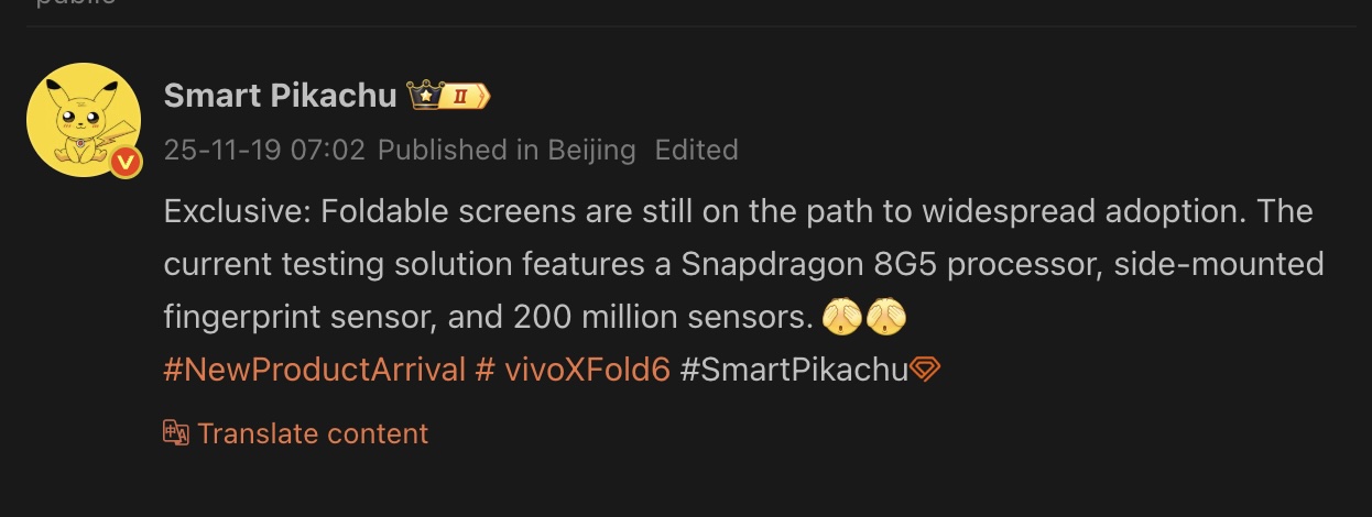 A tippadó azt is sugallja, hogy lesz egy oldalra szerelt ujjlenyomat-olvasó. A többi specifikáció egyelőre rejtély marad. A Vivo zászlóshajója összecsukható okostelefon a tippek szerint 2026 második negyedévében jelenik meg.
