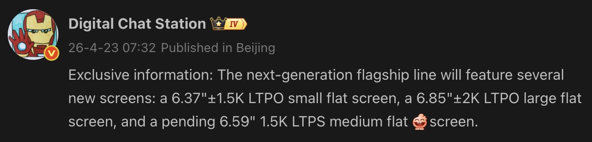 A kompakt modellen kívül a tippadó két másik modell részleteit is megemlítette. Az egyik állítólag egy közepes méretű készülék lesz, 6,59 hüvelykes LTPS panellel, 1,5K felbontással. Lehet még egy készülék lapos, 6,85 hüvelykes LTPO kijelzővel és 2K felbontással. A termékcsalád a tippek szerint maximum 144 Hz-es képfrissítési frekvenciával és ultrahangos ujjlenyomat-olvasóval rendelkezik majd.
