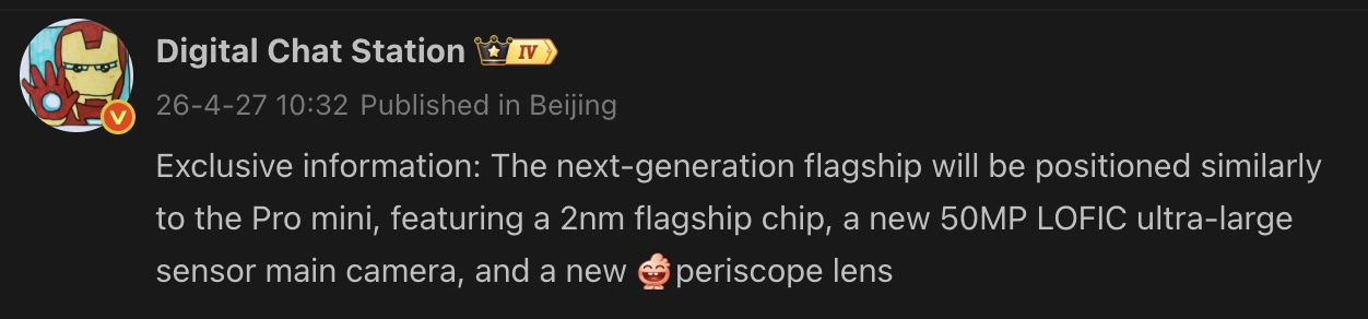A kompakt modell szintén egy 2 nm-es eljáráson alapuló zászlóshajó chipkészlettel rendelkezhet, potenciálisan egy következő generációs Dimensity lapkakészlet. A kameraosztályon 50 megapixeles szenzorral és LOFIC technológiával rendelkezhet. Emellett egy új periszkópos teleobjektívvel is érkezhet.