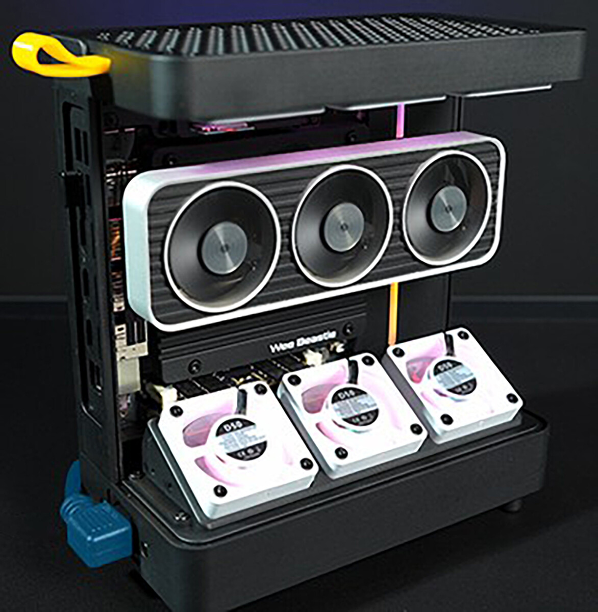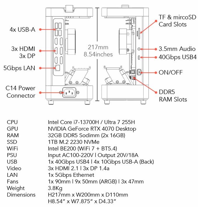 A nyilvánvalóan alacsonyabb ár mellett a Wee Beastie fő előnye a Strix Halo mini PC-kkel szemben a 12 GB VRAM-mal rendelkező MXM RTX 4070 kártya, amely különösen a játékforgatókönyveknél erősebb, 466 TOPS AI feldolgozási sebességgel. Emellett a 4,75 literes ház jobb hűtési megoldást kínál három beszívó ventilátorral az alsó felében, hat elszívó ventilátorral a tetején, valamint a GPU és a CPU tetején elhelyezett három ventilátorral ellátott burkolattal.