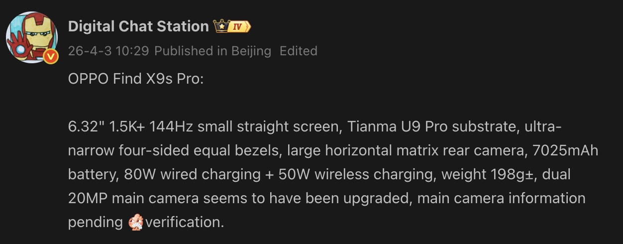Az Oppo hivatalosan megerősítette a hogy a Find X9s Pro április 21-én jelenik meg Kínában. A vállalat eddig annyit árult el, hogy a zászlóshajó telefon kettős 200MP-es szenzorral és Hasselblad tuninggal rendelkezik majd. Most egy prominens tippadó további információkat osztott meg a készülékkel kapcsolatban.