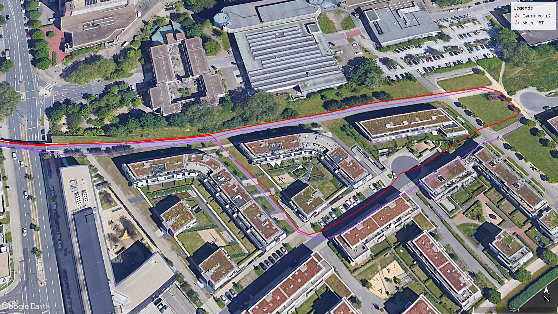 A Xiaomi telefon gyorsan elvégzi a Satfixet a szabadban, nagy pontossággal, 1 méteres pontossággal. Gyakorlati tesztünkben a Xiaomi 15T-t egy Garmin okosórával (Venu 2) hasonlítjuk össze. Mindkettőnek van némi pontatlansága, de a középkategóriás telefon helymeghatározása bőven elegendő a navigációs feladatokhoz.