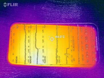 (-) A felső oldalon a maximális hőmérséklet 50.6 °C / 123 F, összehasonlítva a 35.2 °C / 95 F átlagával , 21.9 és 247 °C között a Smartphone osztálynál.