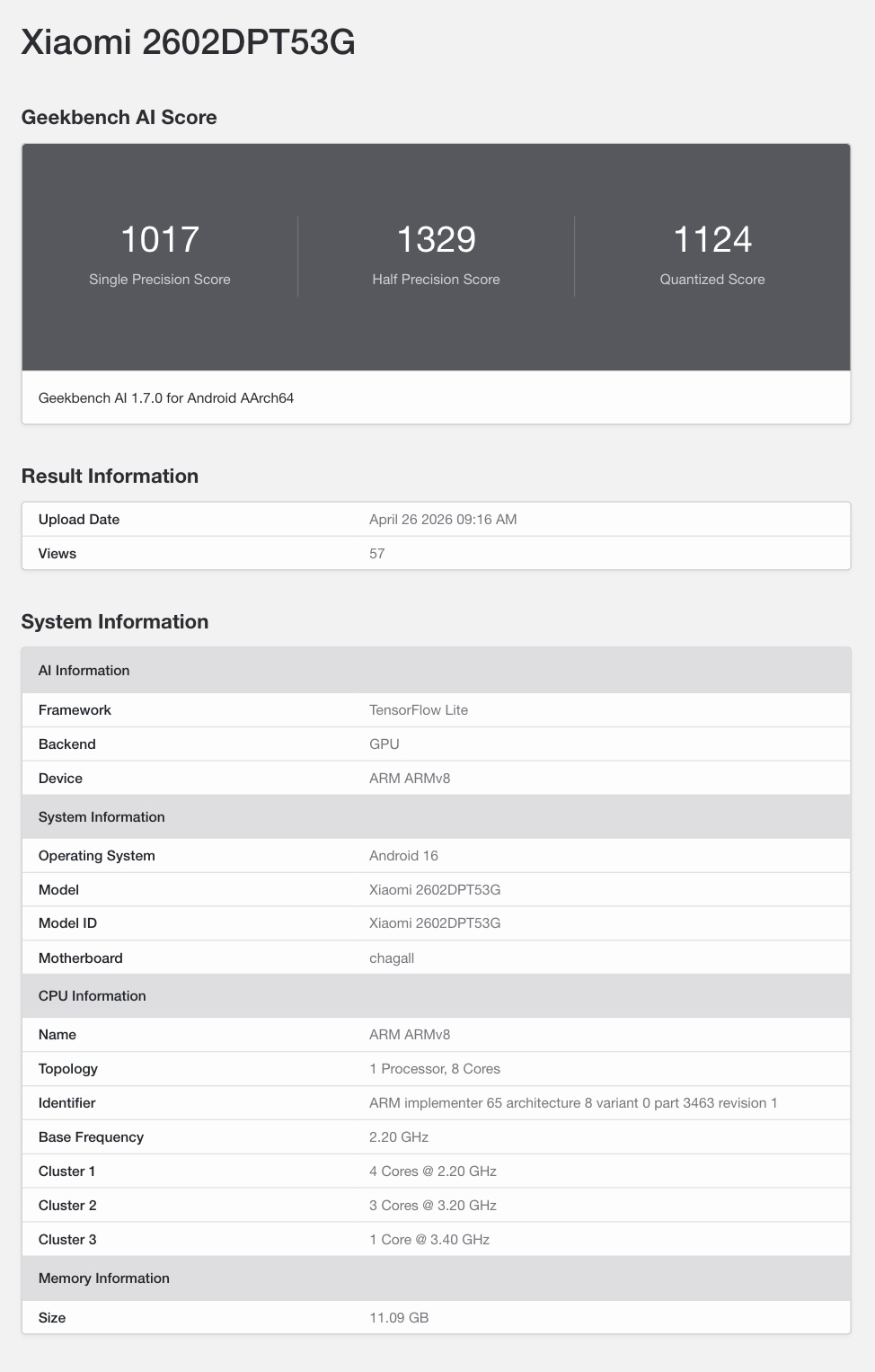 Egy okostelefon bukkant fel a Geekbench oldalon a "2602DPT53G" modellszámmal Hivatkozásképpen, ugyanez a modellszám már korábban több hatósági tanúsítványon is átesett, és várhatóan a szabványos Xiaomi 17T-hez tartozik.
