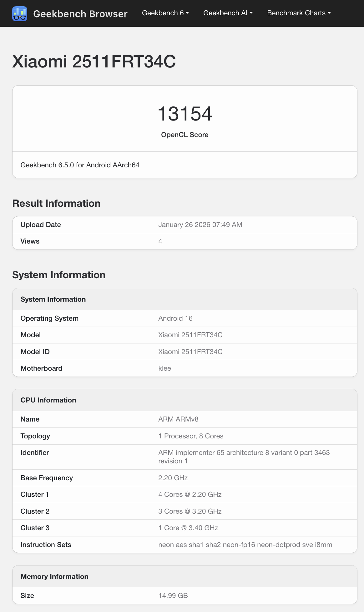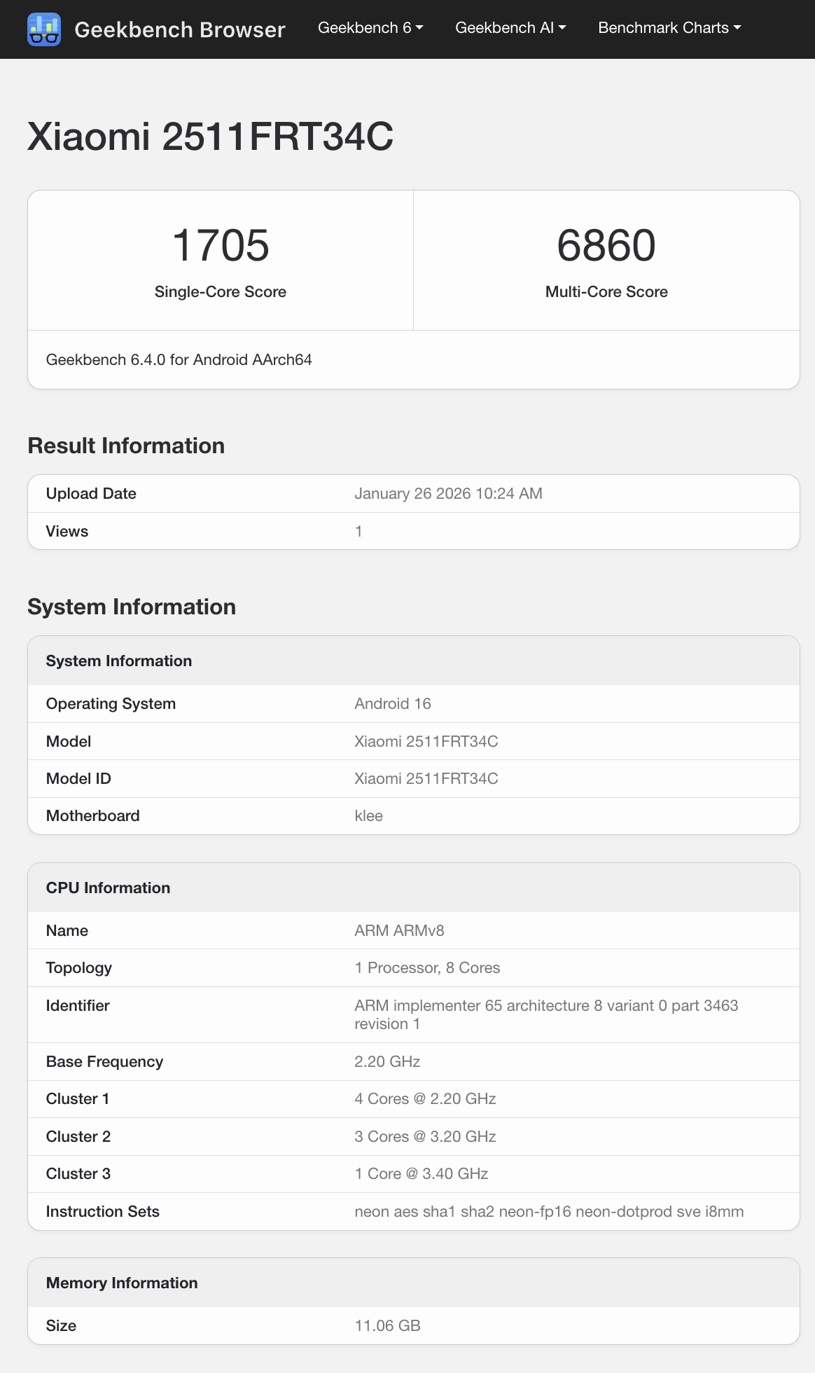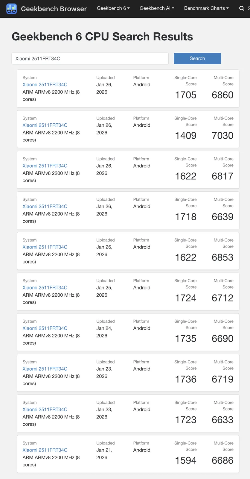 Konkrétan, a Redmi Turbo 5 és a Dimensity 8500 chipset átlagosan 1,659 és 6,764 egy- és többmagos pontszámot ért el a Geekbench 6.5-ben, miközben 12 GB vagy 16 GB RAM-mal párosították. Eközben az eddig megjelent egyetlen GPU-s benchmark szerint a Redmi Turbo 5 13,154 pontot ért el.