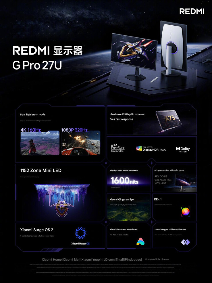 A Redmi Monitor G Pro 27U továbbá 1.600 nites csúcsfényerőt kínál az 1.152 Mini LED helyi fényerőszabályozó zóna jóvoltából. A Redmi Monitor G Pro 27U elődjéhez képest 60%-os javulással 99%-os Adobe RGB és DCI-P3 színtér-lefedettséget biztosít, támogatja a Dolby Vision HDR-t és VESA DisplayHDR 1000 tanúsítvánnyal rendelkezik. Referenciaként a monitor a következő I/O-kat tartalmazza: