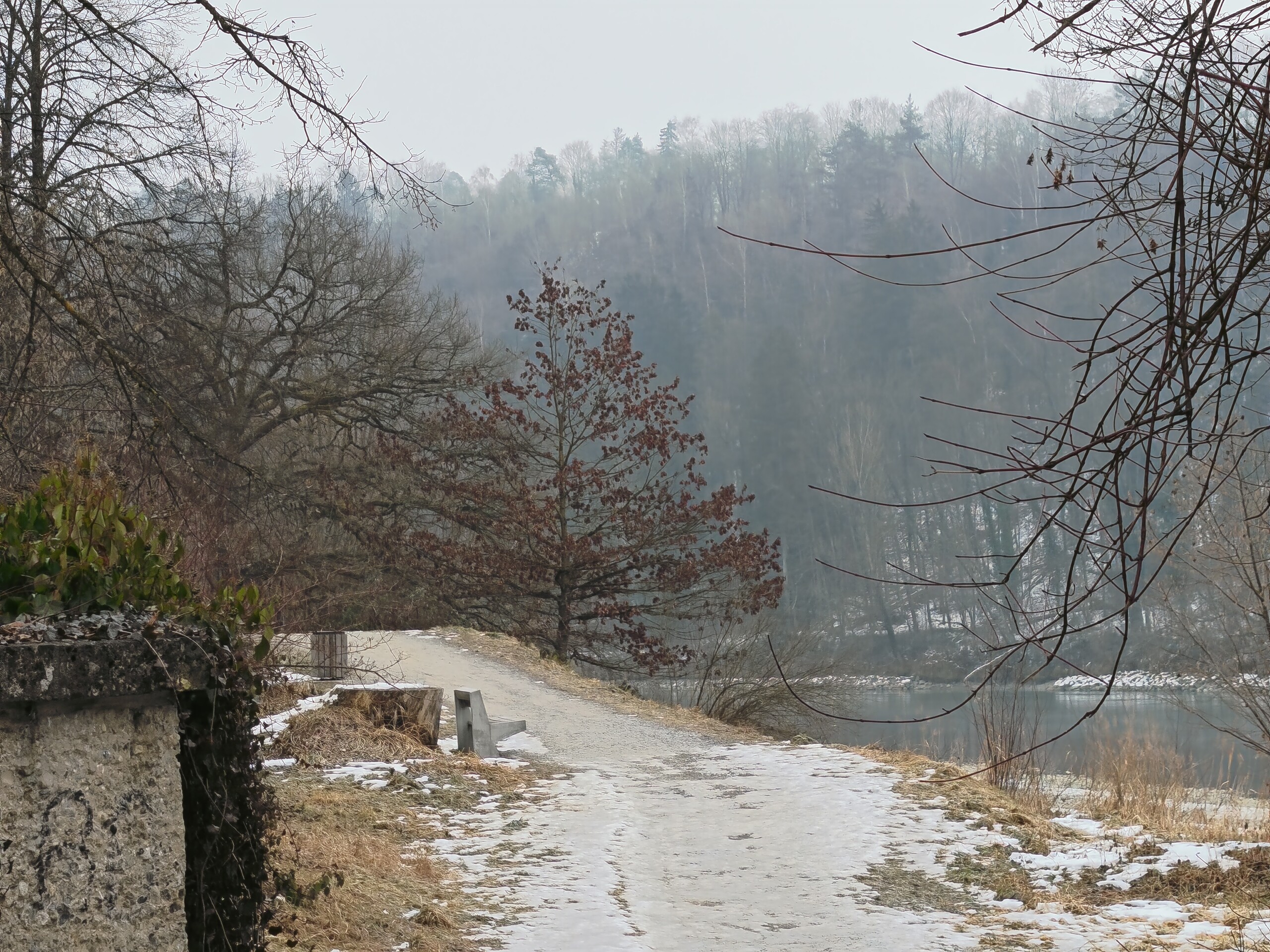 A túraútvonalról és a folyóról készült felvételen a leveles fa túlélesítettnek tűnik, és az általános élesség pontatlan.