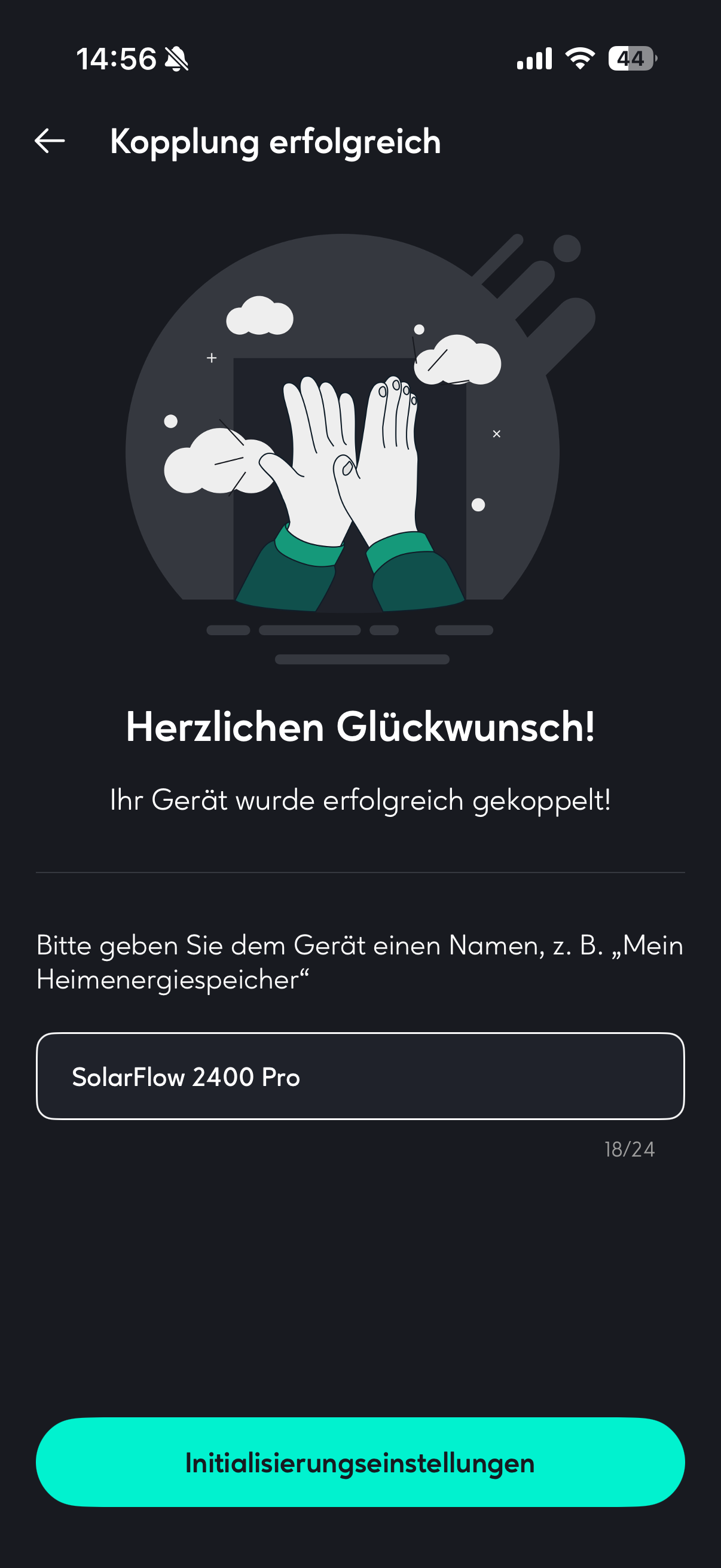 Most csatlakoztassa a napelemmodulokat a négy pár MC4 csatlakozóhoz. Ezután a rendszert a mellékelt 3 m hosszú váltóáramú kábellel csatlakoztassa egy konnektorhoz. A SolarFlow 2400 Pro most már üzemkész, és az alkalmazáson keresztül beállítható.