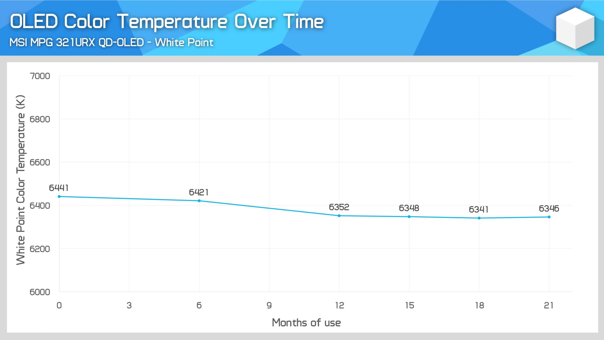 Az előző frissítéshez hasonlóan a legszembetűnőbb artefaktumok továbbra is a Windows tálcája, a két egymás melletti alkalmazást elválasztó határvonal, valamint a jobb oldali beégés, ahol a leggyakrabban használt statikus alkalmazás kapott helyet. A 18 hónapos frissítéshez hasonlóan az MU is arról számol be, hogy a zöld alpixelek tűnnek a legrosszabbul romlottnak, őket követi a kék, majd a piros alpixelek. Az MSI MPG 321URX színhőmérséklete azonban az MSI MPG 321URX QD-OLED játékmonitor ellenállt a további eltéréseknek.