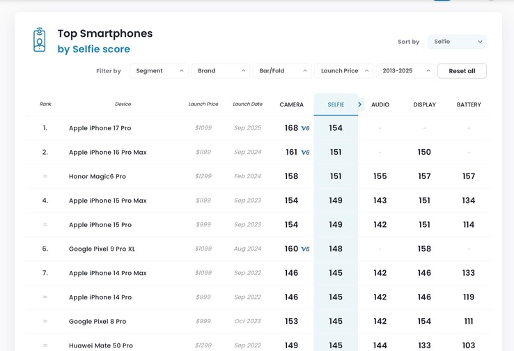 A DxOMark részletes elemzése szerint ez a frissítés egyértelműen kifizetődött, mivel az iPhone 17 Pro 154 pontot szerzett a szelfikamera értékelésében, és a ranglista első helyét foglalja el. Apple'Az új zászlóshajó megelőzi az iPhone 16 Pro-t és a Honor Magic6 Pro-t, amelyek mindketten 151 pontot kaptak, és a második helyen állnak, őket követi az iPhone 15 Pro 149 ponttal és a Google Pixel 9 Pro XL 148 ponttal.