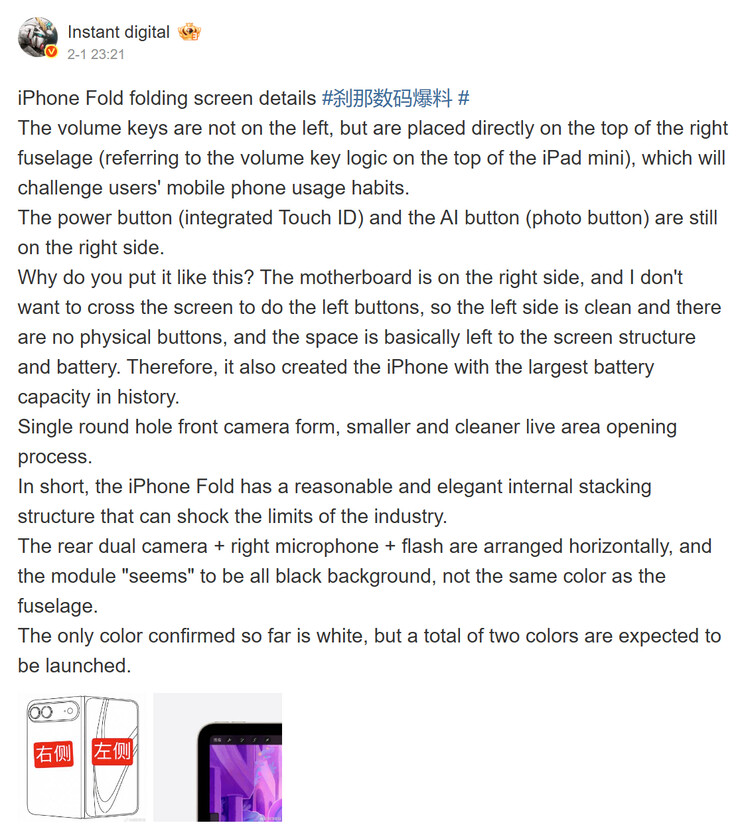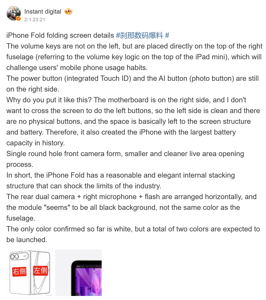 Úgy tűnik, az iPhone Fold az iPad minit utánozza majd azzal, hogy az összes gombja a jobb oldalon található, beleértve a Touch ID-t használó bekapcsológombot is. Az ezen a felén is egymásra helyezett logikai lap állítólag kiküszöböli a felesleges kábelezést. Jelenleg a Apple várhatóan két színváltozatban fogja piacra dobni az iPhone Foldot, bár eddig állítólag csak egy fehér színű, "teljesen fekete" kameramodullal ellátott változatot erősítettek meg.