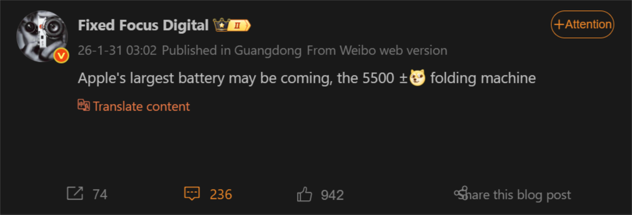 A Fixed Focus Digital például nemrég arról tájékoztatta követőit, hogy az iPhone Fold az eddigi legnagyobb akkumulátorral fog érkezni. A Weibo-n írva azt állították, hogy az iPhone Fold egy cirka 5500 mah kapacitású akkumulátorral érkezik.