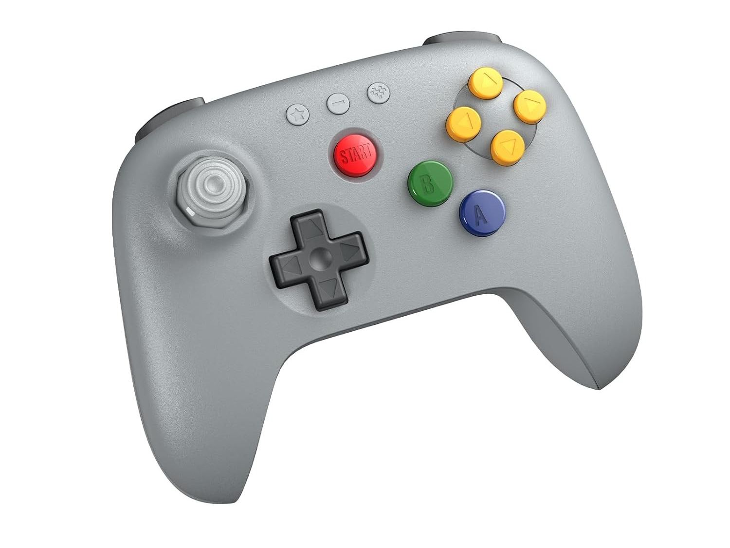 A szürke 8BitDo 64 Bluetooth-vezérlő az eredeti Nintendo 64-vezérlő színét követi szürke burkolatával, sárga C-gombjaival, kék A-gombjával, zöld B-gombjával és piros startgombjával. A D-pad a vállgombokkal és a ravaszokkal együtt sötétszürke.